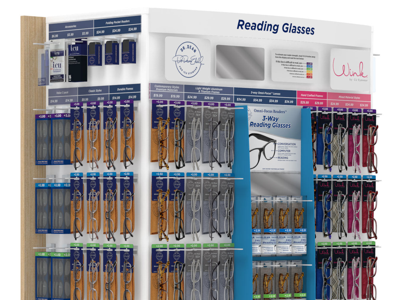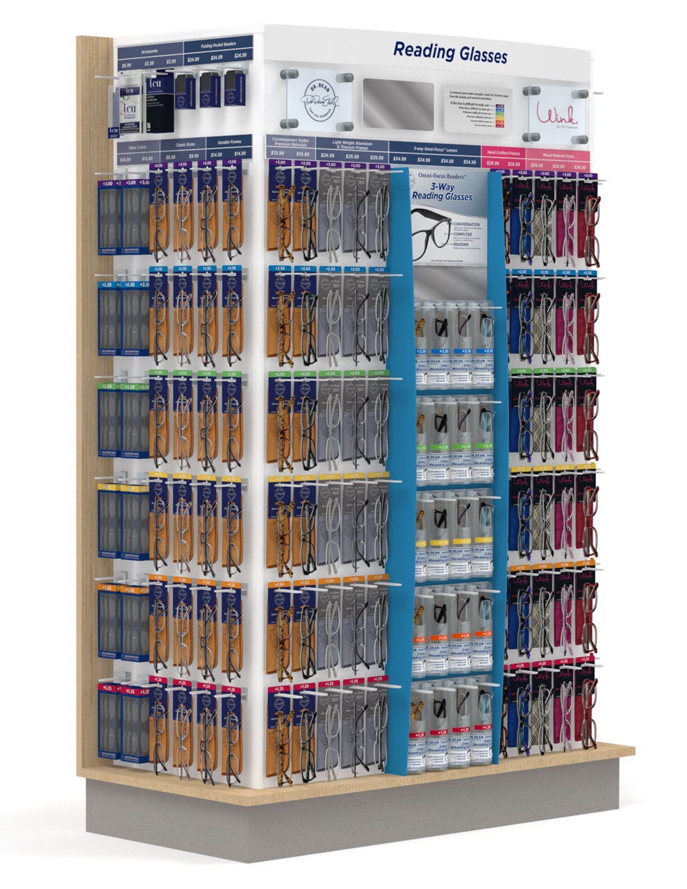 This 3D rendering was prepared to study the product mix for an in-store product display for Walgreens. The actual products that will appear in the store are represented.